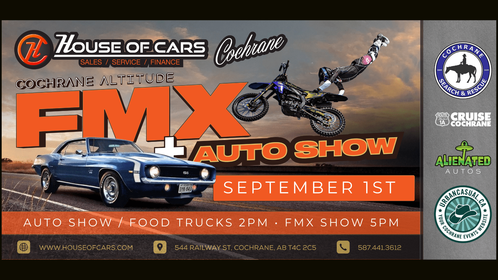 Join us for a free, family event – a freestyle motorcross event featuring local FMX rider Cody Matechuk & Team + automotive show by Cruise Cochrane on Monday, September 1, 2025 at House of Cars in Cochrane.
