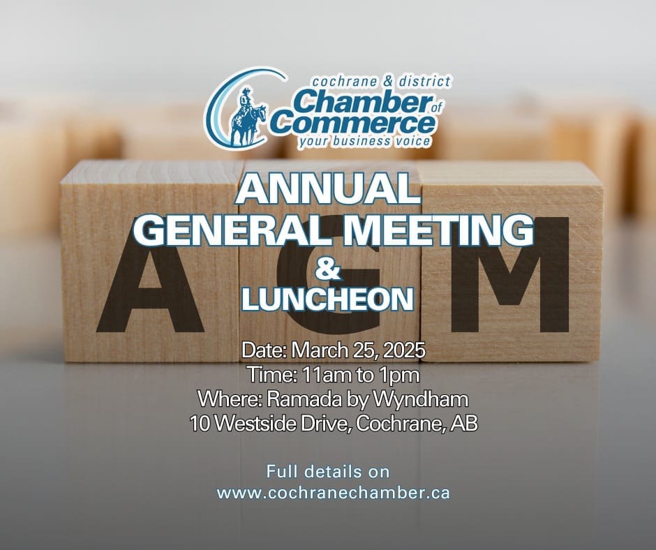 The Annual General Meeting (AGM) of the Cochrane & District Chamber of Commerce will occur on Tuesday, March 25, 2025 from 11:00 am – 1:00 pm at Ramada by Windham