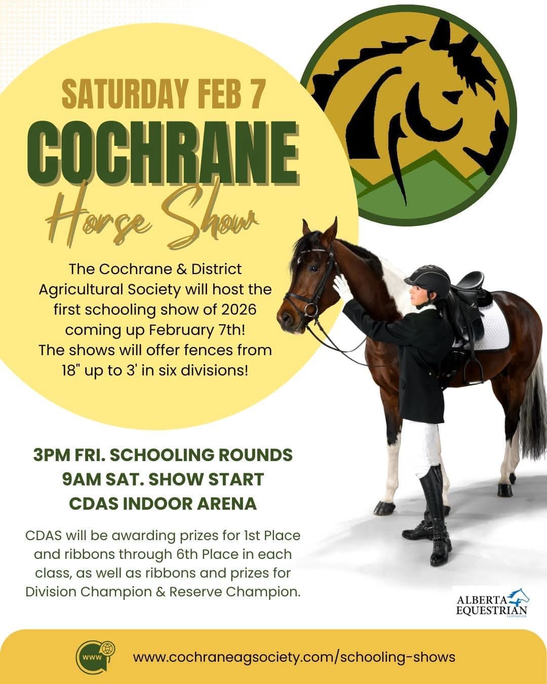 Register now for the Cochrane Horse Show, February 7th!Schooling Rounds on Friday the 6th at 3pm.6 Divisions and up to 29 Classes!More details and registration link below:https://www.cochraneagsociety.com/schooling-shows.html