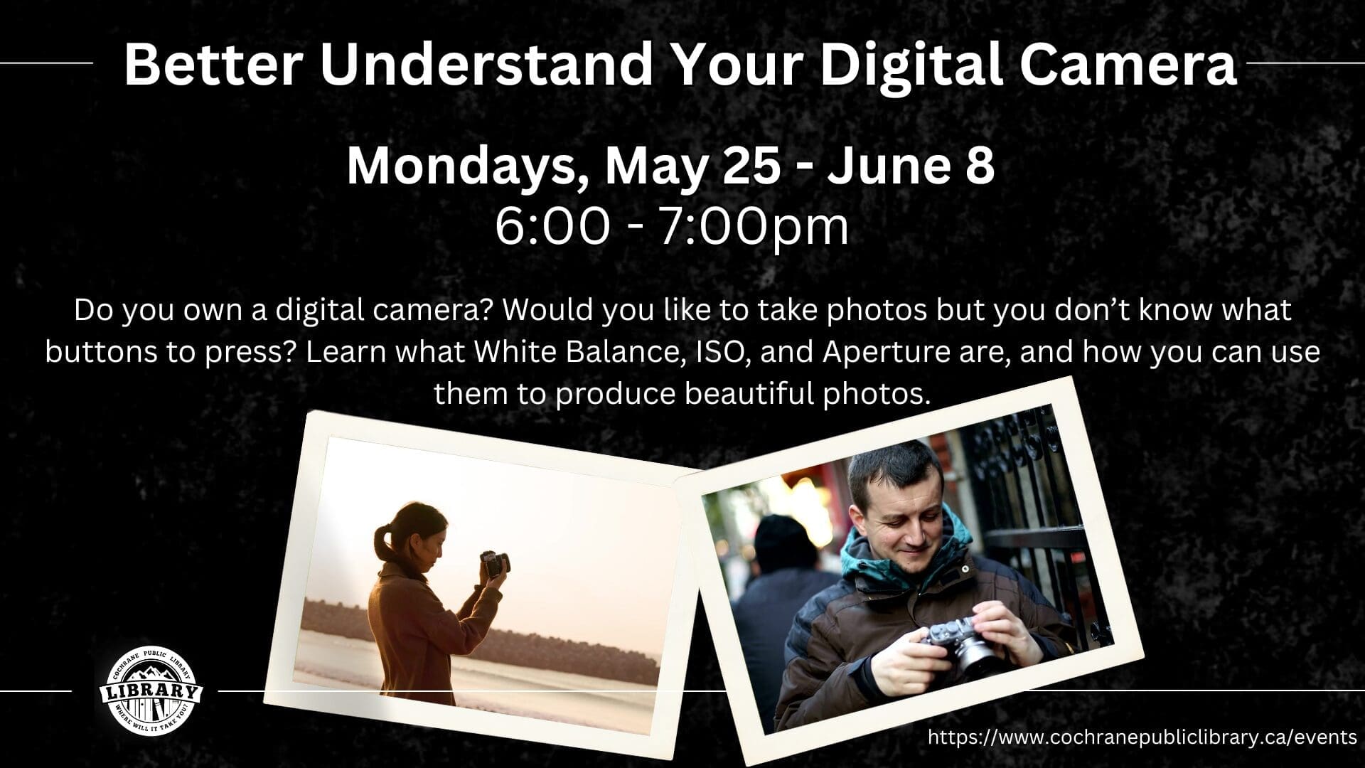 Jun 1 Better Understand Your Digital Camera 6:00 pm - 7:00 pm Cochrane Public Library 405 Railway Street W, Cochrane Event Details Get Directions