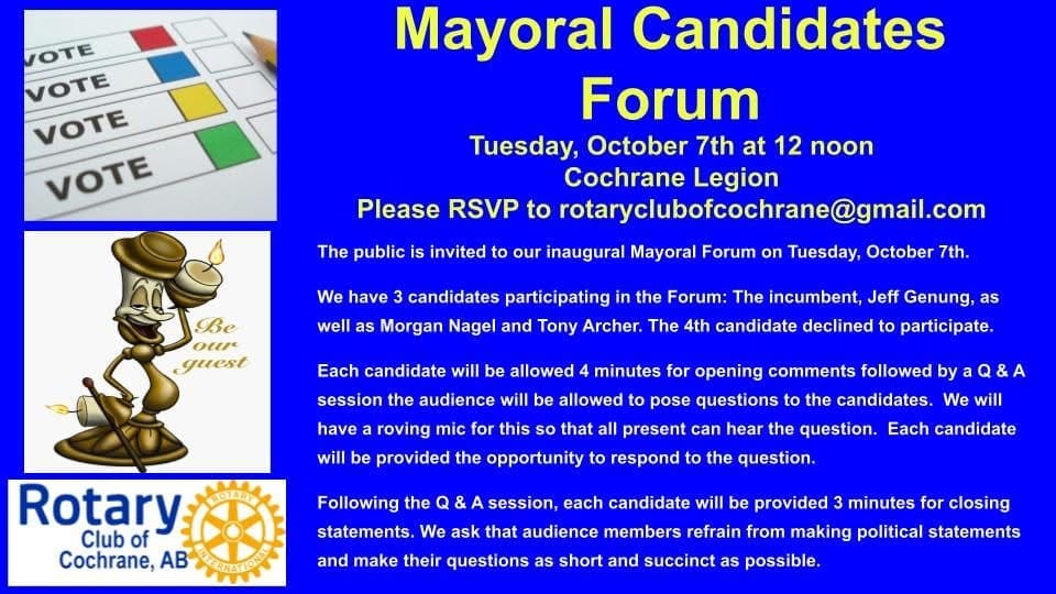 Join us on Saturday, October 4th at 5:30 pm for a Candidate Forum at the SOTB Auditorium. Get a chance to meet the candidates for the upcoming Cochrane election and hear them answer some questions about their ideas for our great town.