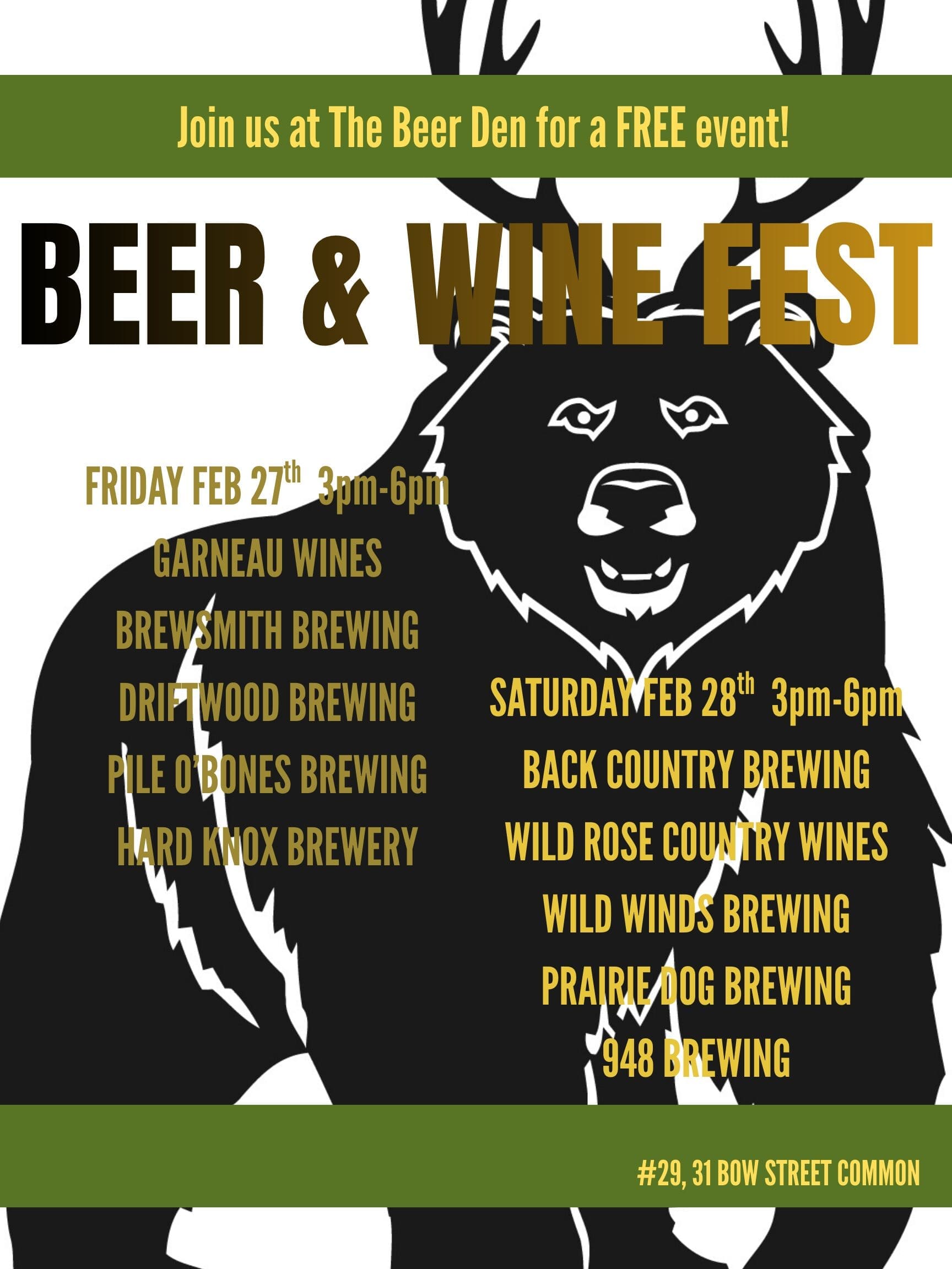 The Beer Den is holding it's annual Beer and Winefest Friday, Feb.27th from 3-6 pm and Saturday, Feb.28th from 2-5:30 pm. Come and sample some awesome Boutique wines and 8 different breweries from B.C., AB. and Saskatchewan throughout the two days. The best thing is there is no cost!