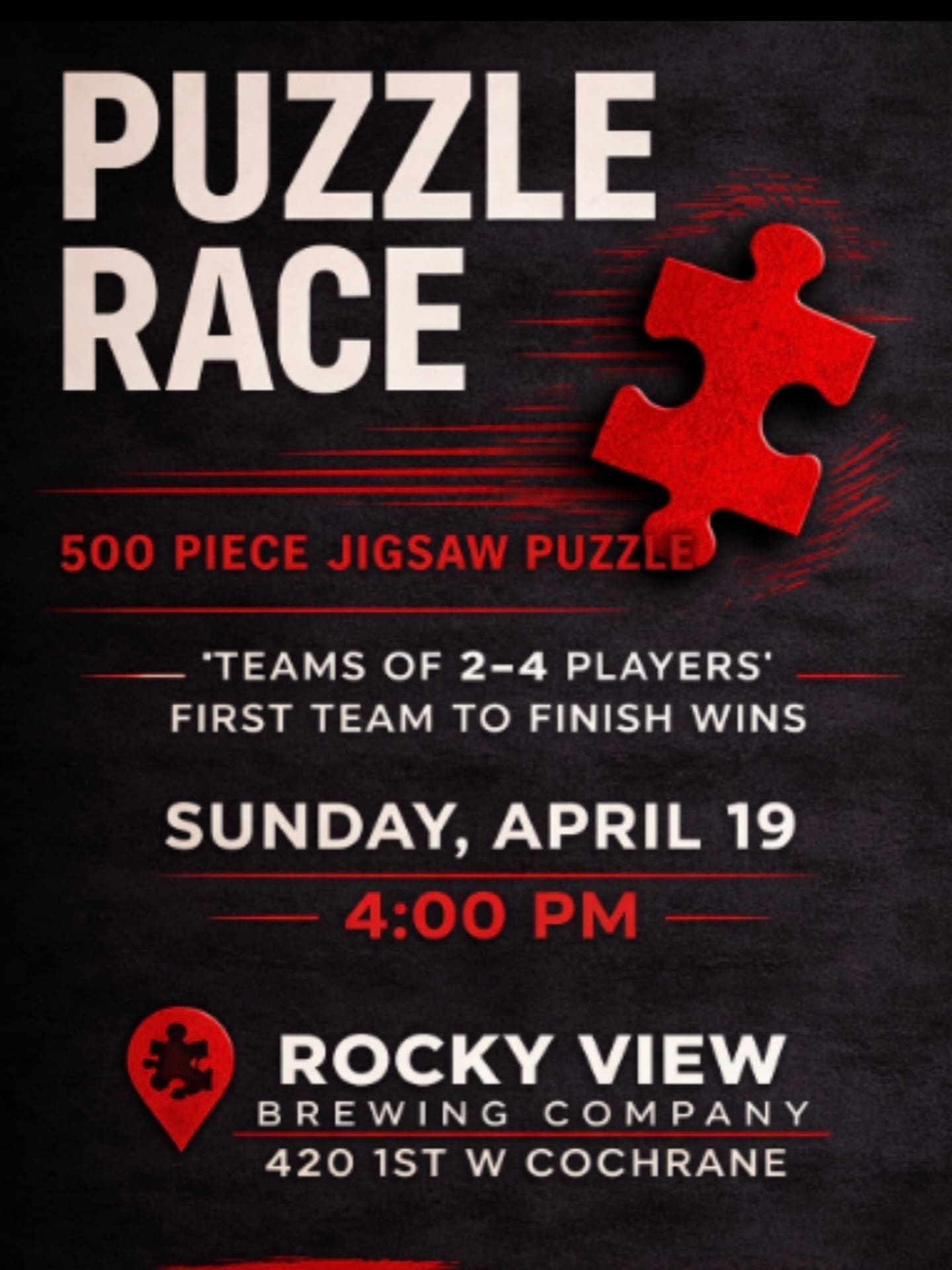 Apr 19 PUZZLE RACE *registration required 4:00 pm - 6:00 pm Rocky View Taproom 420 1st Street, Cochrane Event Details Get Directions