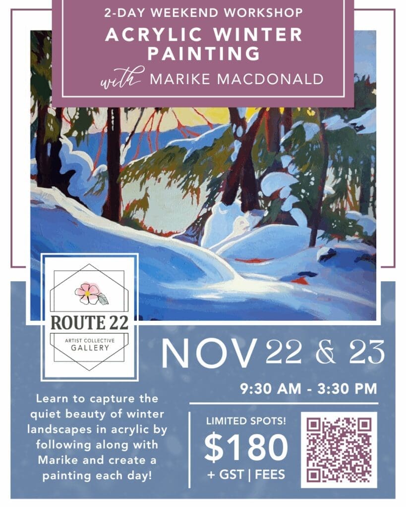 Acrylic Winter Painting! Follow along with Marike MacDonald in this 2-day weekend workshop and learn to capture the quiet beauty of winter landscapes in acrylic painting! Explore new techniques and […]