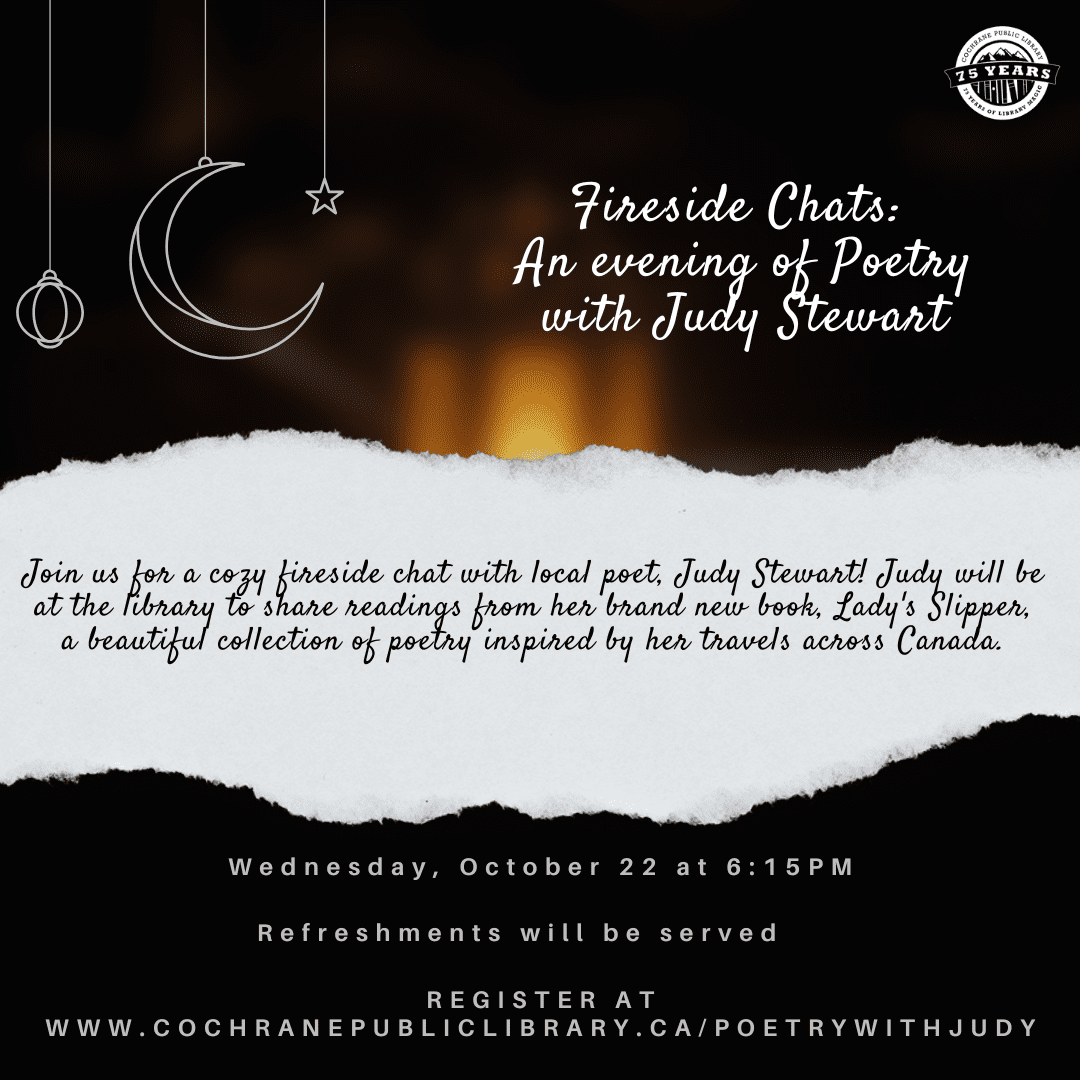 We're excited to welcome back local author and budding poet Judy Stewart to the Cochrane Public Library for a special fireside chat! After her successful event, Poetic Echoes, with her sister this summer, we are so excited to have her return to share her own brand new book, Lady's Slipper. This collection of short stories […]