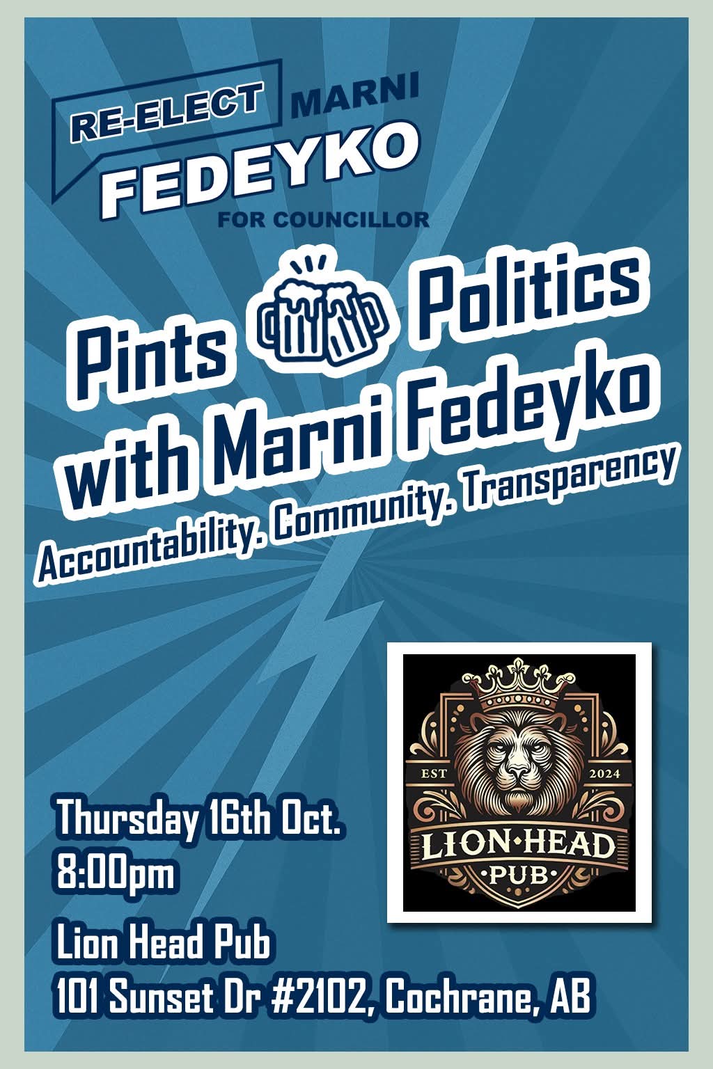 Lion Head Pub 101 Sunset Drive, Cochrane, AlbertaJoin me for PINTS AND POLITICS talk on October 16th after 8 p.m. at the Lion Head Pub. This is an opportunity to ask me any questions you may have and enjoy the following special. The PBR is $6 all night and happy hour pitchers ($3 off) all night of any pitcher. Also, 1/2 price […]
