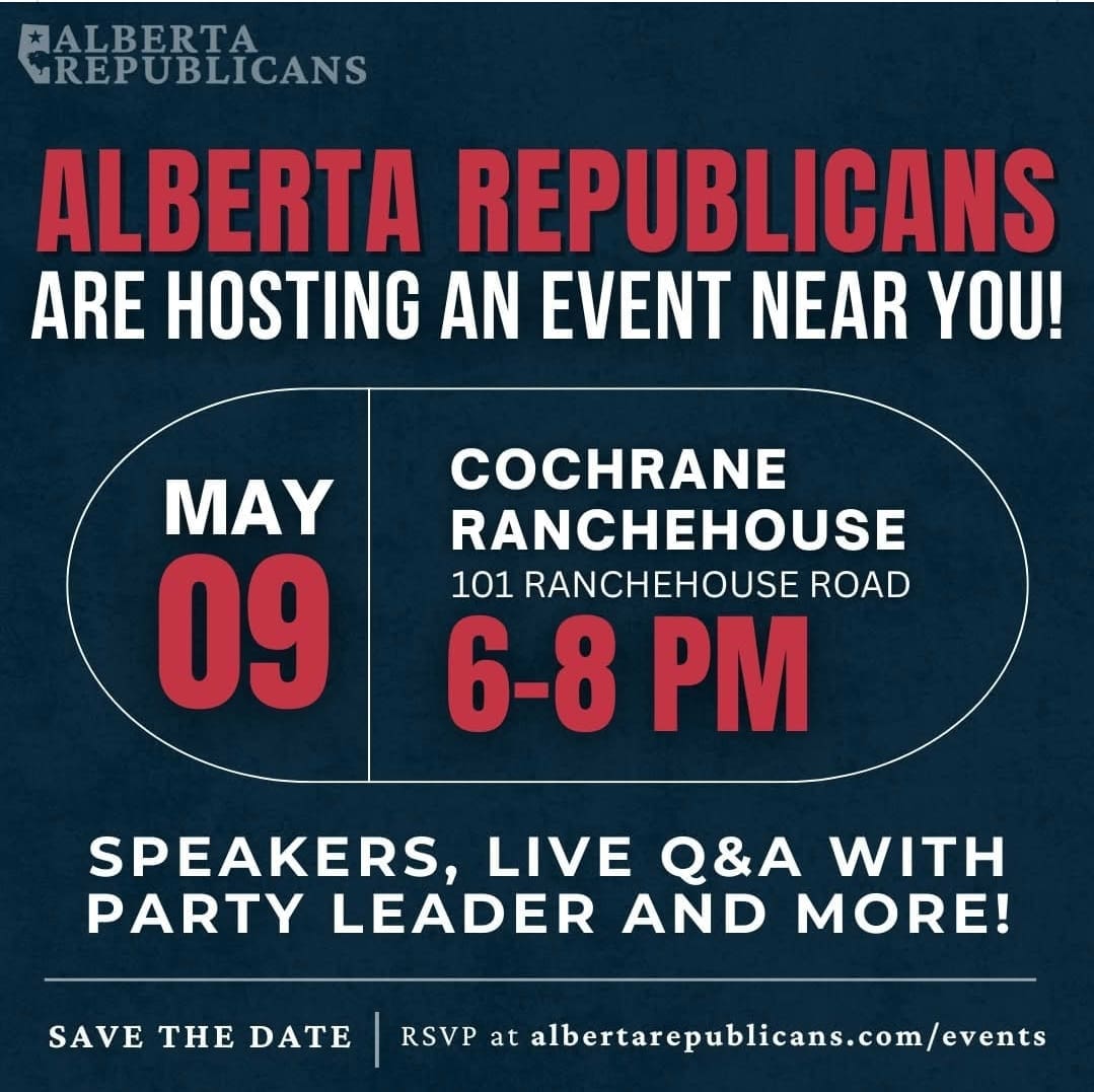 📢Cochrane — We're coming to you! Join the Alberta Republicans at The Cochrane Ranchehouse on May 9th from 6–8 PM! 📅 Mark your calendars — bring your questions and your friends! ⭐ RSVP now at albertarepublicans.com/arp-events/cochrane-ranchehouse/